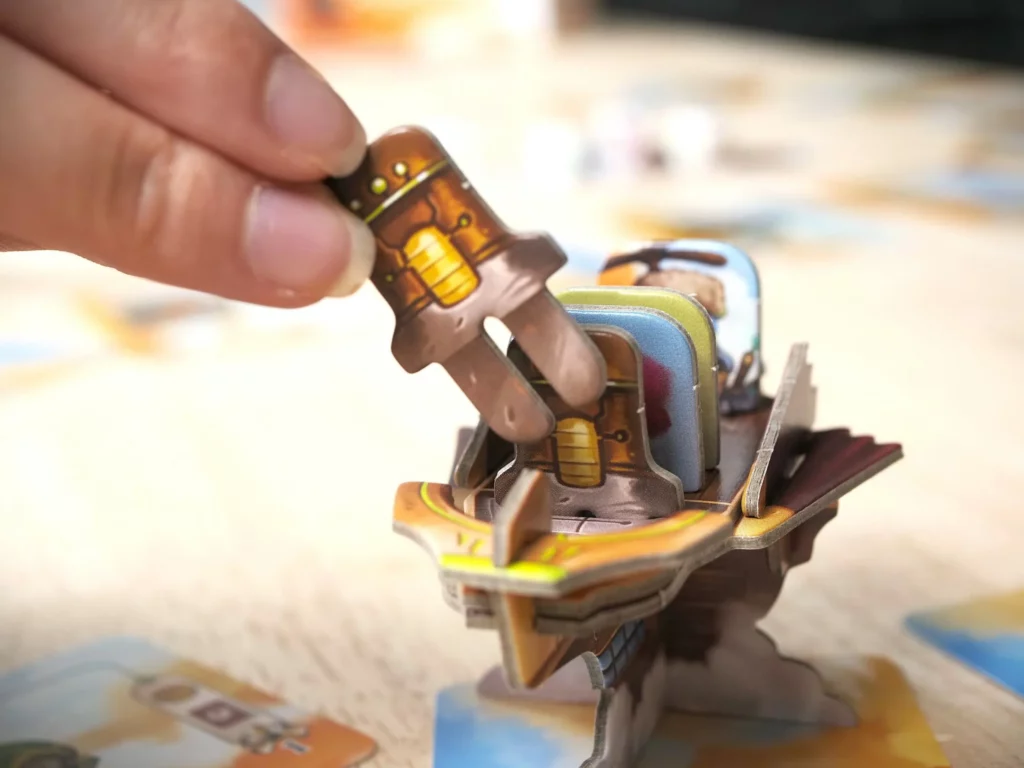 Parce que le challenge n’était pas si évident. En effet, en multi joueurs, on a cette tension progressive de l’astronef qui avance, étape après étape, avec ces regards en coin entre les joueurs, en se demandant qui va rester à bord, qui va « se dégonfler » et descendre. L’équipage s’amenuise peu à peu… bien souvent jusqu’à la chute finale, sous les regards goguenards de ceux qui ont été plus prudents.